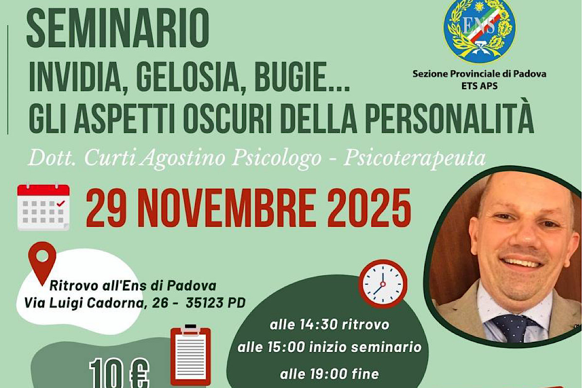 AGGIORNAMENTO - DOTT. AGOSTINO CURTI: “INVIDIA, GELOSIA, BUGIE… GLI ASPETTI OSCURI DELLA PERSONALITÀ” - ULTIMI POSTI DISPONIBILI