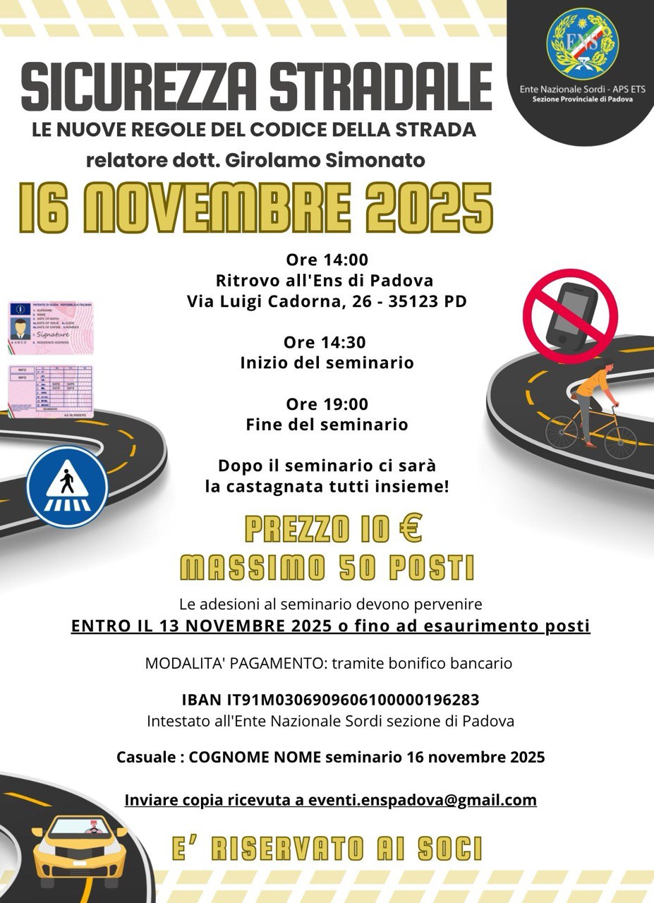 La Sezione Provinciale ENS di Padova organizza il seminario “Sicurezza stradale e le nuove regole del Codice della Strada”, con relatore l’ex agente della Polizia Municipale sig. Girolamo Simonato. È’ garantito il servizio interpretariato LIS. La quota di partecipazione è di 10 €, da versare tramite bonifico all’IBAN IT 91 M 03069 09606 1000 00196283, indicando come causale “COGNOME NOME seminario 16 novembre 2025”. La ricevuta del pagamento deve essere inviata a Questo indirizzo email è protetto dagli spambots. È necessario abilitare JavaScript per vederlo. entro il 13 novembre 2025.