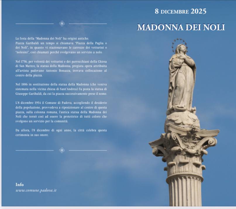 ENS Padova informa che lunedì 8 dicembre 2025 alle 12:00, in Piazza Garibaldi (Padova), si terrà la tradizionale cerimonia in onore della Madonna dei Noli.